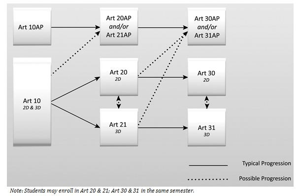Students who enter this program sequence engage in conceptual work involving self-expression. They complete a body of work for portfolio development while fulfilling the requirements for Art 10, 20, 21, 30 or 31. Students have the opportunity to submit a body of work to be professionally juried. Credit for a university level course may be awarded based on their AP portfolio assessment